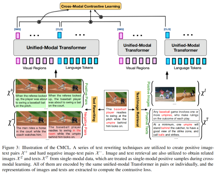 该工作的主要亮点是通过单塔的Transformer模型来同时编码文本和图像数据。模型总共有三大类预训练任务,除了比较常规的视觉单模态学习任务(mask区域恢复和region分类)以及文本单模态学习任务(MLM任务和seq2seq生成),该论文还提出了跨模态的对比学习,通过对文本进行词级别、片段级别和句子级别重写以及图文检索,产生各种粒度的图文正负样本进行跨模态的对比学习。从而能够更好的在同一个语义空间去学习这些单模态、多模态信息。模型结构如下: