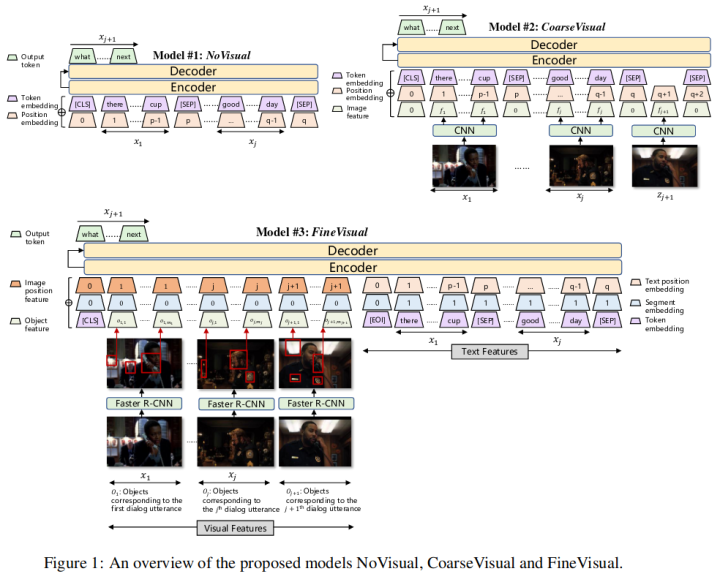 这项工作提出了一个多模态对话生成的一个框架,使得每个对话回合都与发生对话的视觉上下文相关联。具体的说,该工作首先提出了普通的视觉模型来提取视觉特征并将其合并到序列到序列对话框生成中,其中每个模型在不同的级别提取视觉特征:从仅使用文本特征到使用粗粒度图像级特征,再到细粒度对象级特征。然后,发现模型学习到的文本特征和视觉特征的关联程度任然不高,该工作提出要对文本和视觉特征之间的相互依赖性进行建模,即对话模型不仅需要了解在前面的对话话语和视觉上下文中生成下一个话语的概率,还需要建模在对话话语中预测视觉特征的后向概率,以引导模型生成特定于视觉上下文的对话语句。