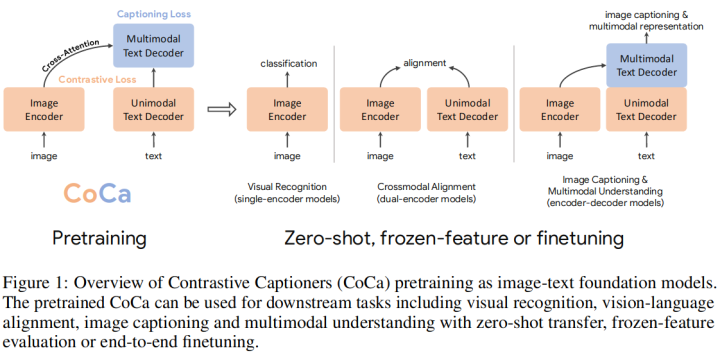 这项工作主要亮点是设计了一个能同时包含图文对比学习和标题生成的多模态预训练模型。模型共分为三个部分:Image Encoder, Unimodal Text Decoder和Multimodal Text Decoder。模型首先将图文分别输入到Image Encoder和Unimodal Text Decoder,将两者得到的表示进行对比学习,得到对比学习的损失;然后在将两个表示输入到Multimodal Text Decoder进行Cross Attention,使用Auto Regressive的方法来生成输入文本,得到文本生成的损失。该模型通过这样的预训练方式来同时学习图文对比和文本生成能力。模型图如下所示: