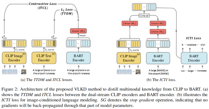 该工作之前的多模态预训练模型(如CLIP)在各种多模态对齐任务上取得了不错的效果,但由于其文本编码器较弱,在文本生成任务上的表现不佳。为了解决这个问题,该工作提出将 CLIP 的多模态知识蒸馏到 BART 上,以获得一个同时具有多模态知识和文本生成能力的模型。本文使用了三个目标函数来实现多模态知识蒸馏: