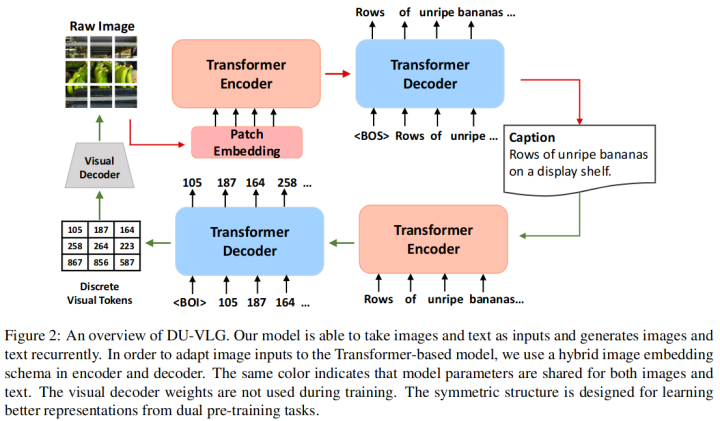 这项工作提出了一个具有视觉和语言生成双序列到序列预训练的模型 DU-VLG (DUal sequence-to-sequence pre-training for Vision-and-Language Generation)。这个模型是Transformer的Encoder-Decoder结构,它可以文本(或图像)为输入,自回归的生成对应的图像(或文本)。为了训练这个模型,该工作提出了两个预训练任务:Multi-modal Denoising Autoencoder Task 和 Modality Translation Task。第一个预训练任务类似MLM,将带有随机屏蔽的图像或单词的图文对作为输入,并通过重建损坏的模态来学习图像文本对齐。第二个任务则是跨模态的生成。通过这两个任务来增强模型的语义对齐能力。此外,本文还提出了一种新的commitment loss来驱动模型获得更好的图像表示。下游的微调任务表明该模型在Image Captioning, Visual Commonsense Reasoning等任务上均有提升。