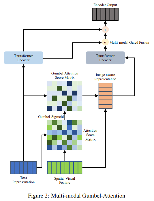 多模态机器翻译(MMT)通过引入视觉信息来提高翻译质量。然而,现有的MMT模型忽略了图像会带来与文本无关的信息,对模型造成很大的噪声,影响翻译质量的问题。该工作提出了一种新的用于多模态机器翻译的Gumbel-Attention方法,它可以选择图像特征中与文本相关的部分。具体来说,与以往基于注意的方法不同,它首先使用可微方法来选择图像信息,并自动去除图像特征中无用的部分。通过Gumbel-Attention得分矩阵和图像特征,生成图像感知的文本表示。然后使用多模态编码器对文本表示和图像感知文本表示进行独立编码。最后,通过多模态门控融合得到编码器的最终输出。实验和案例分析表明,该方法保留了与文本相关的图像特征,其余部分有助于MMT模型生成更好的翻译。
