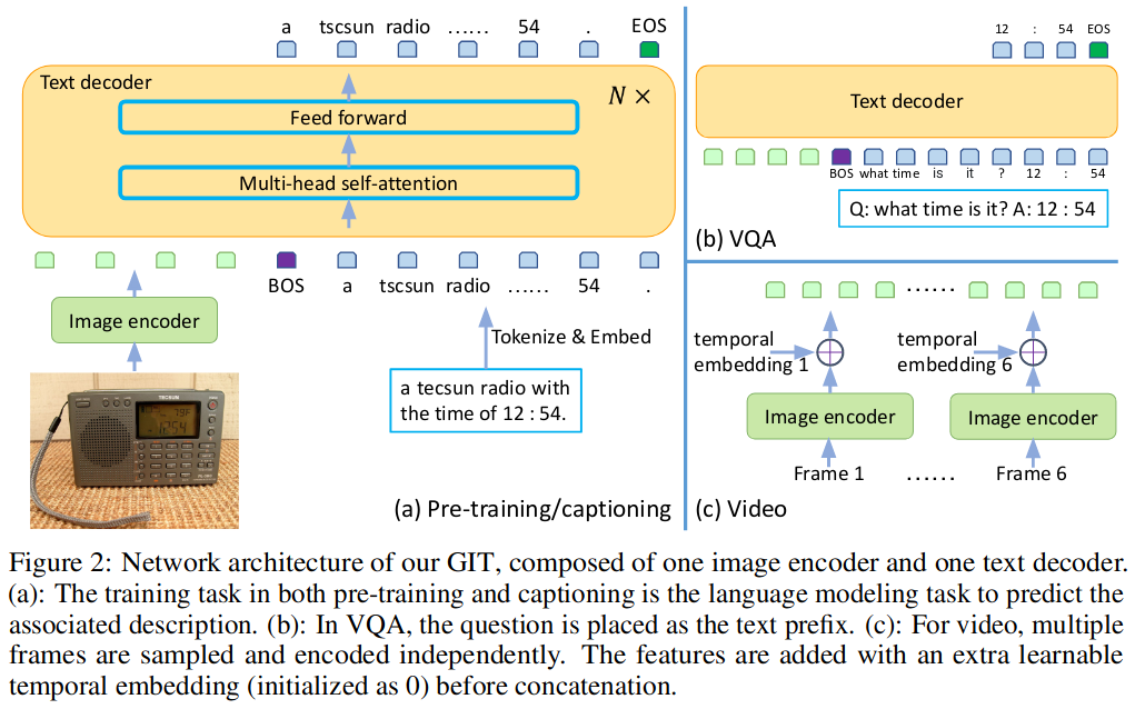 本文的主要亮点是设计并训练了一个生成式图像到文本转换器GIT,以统一图像/视频字幕和问答等视觉语言任务。虽然生成模型在预训练和微调之间提供了一致的网络架构,但现有的工作通常包含复杂的结构(单/多模态编码器/解码器),并且依赖于外部模块,如对象检测器/标记器和光学字符识别(OCR)。本文提出的模型仅包含两个部分:一个图像编码器和一个文本解码器。图像编码器部分是一个类似Swin的视觉Transformer,它基于对比学习任务在大量图像-文本对进行预训练。而文本解码器部分则采用了类似UniLM的方法,将视觉部分的编码作为前缀,然后用Auto Regressive的方法来生成文本。尽管这个模型并不复杂,但在扩大了预训练数据和模型大小后,该模型在Image Caption, VQA, Video Caption and Question Answering, Scene Text Recognition等多项任务上都取得了良好的性能。