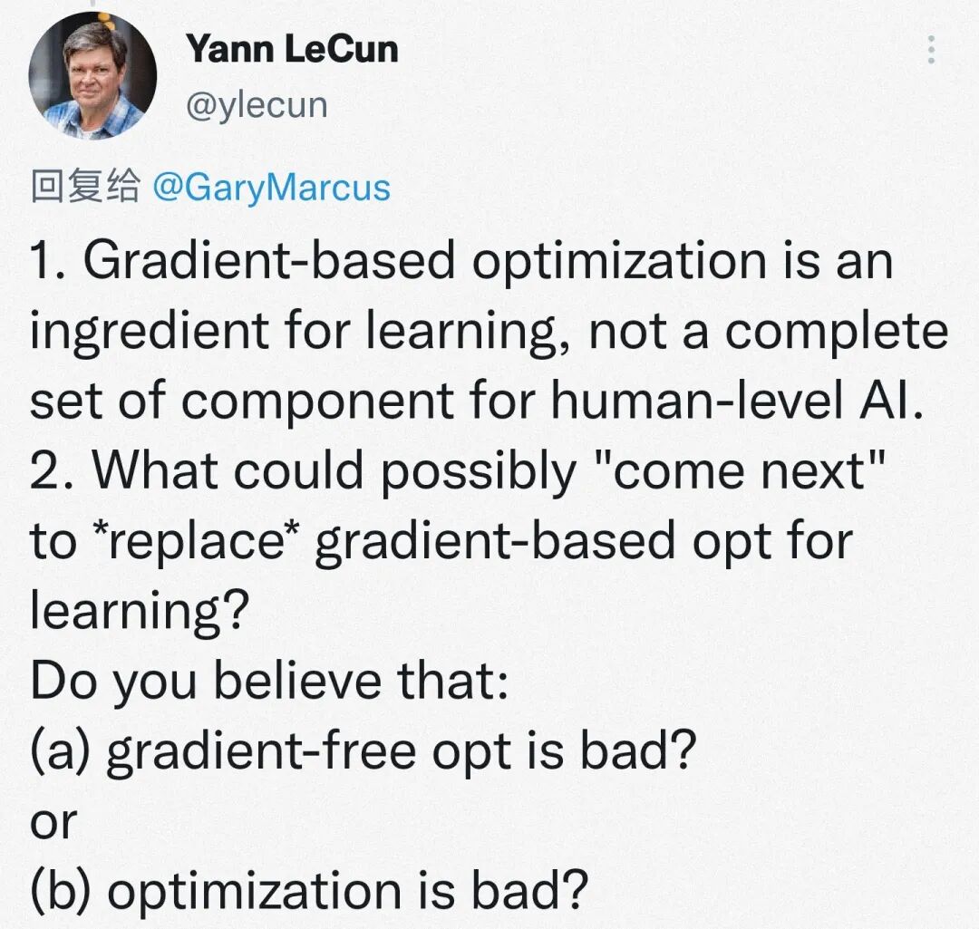 但是,LeCun并不买账,他接着Marcus的话回复: