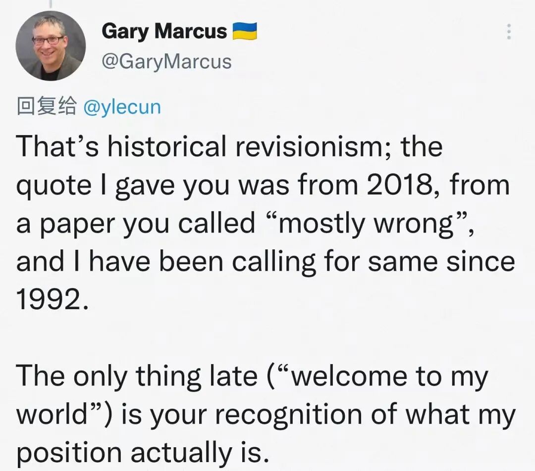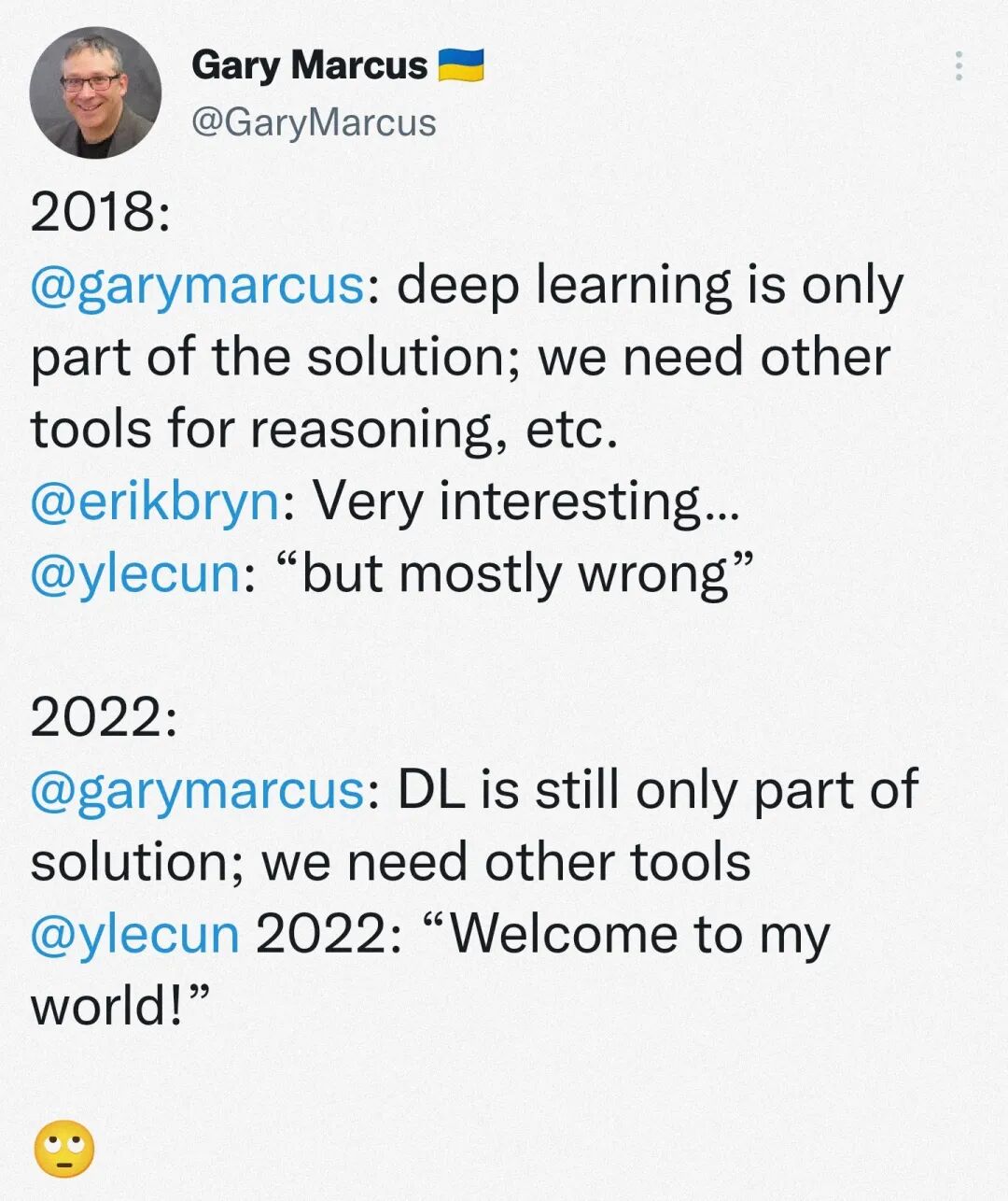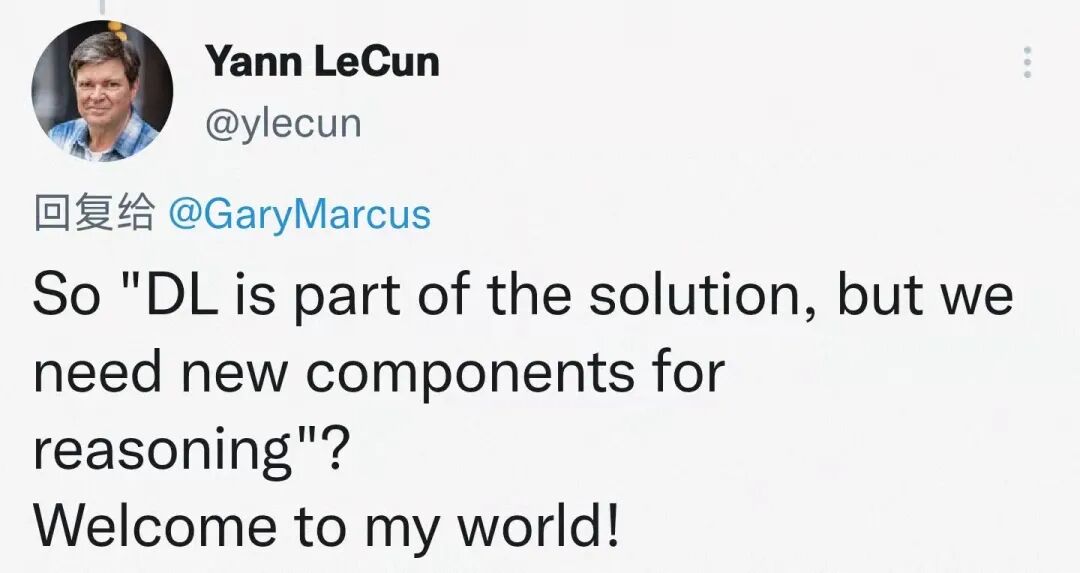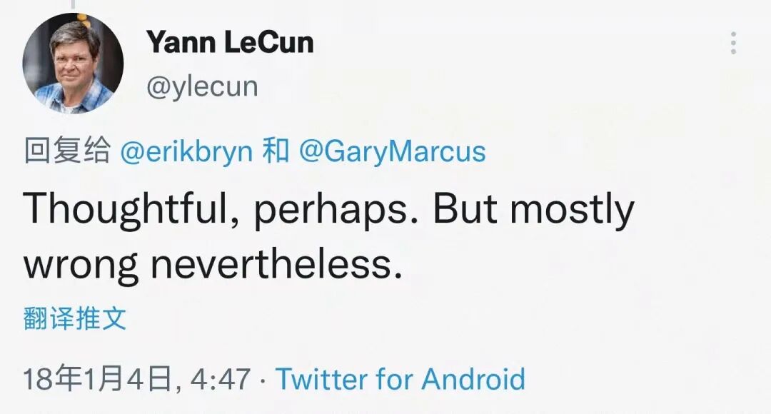 那就来翻翻旧账,针对Marcus在2018年写的那篇文章,LeCun的确曾这样评论(虾仁猪心):