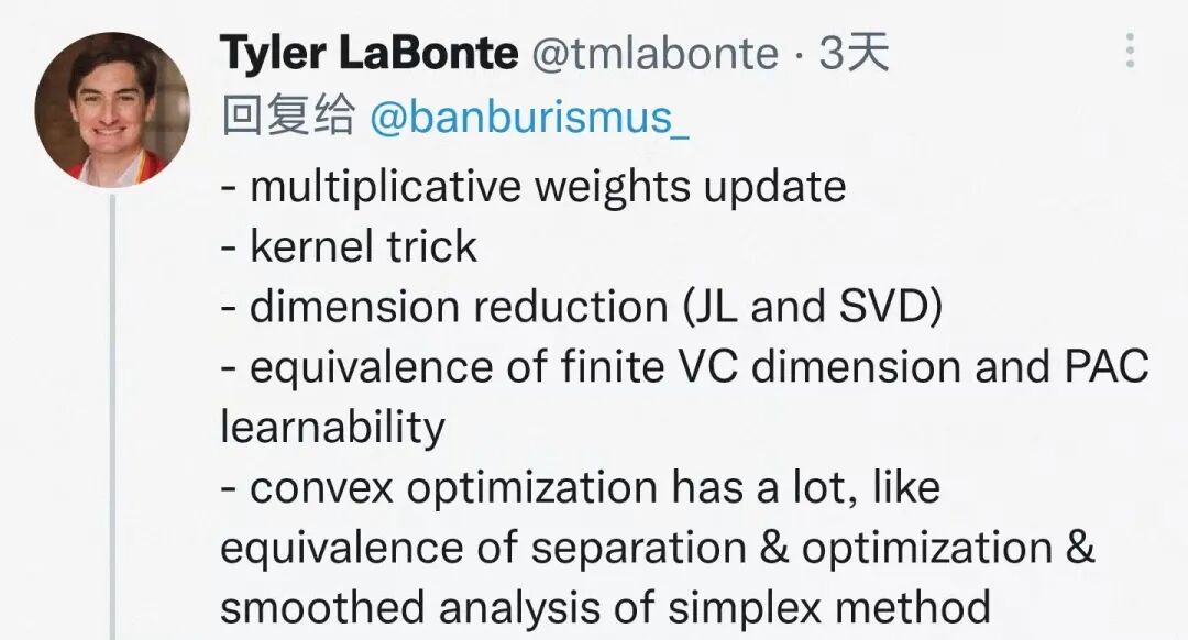 于是网友们都来认真答题:多重权重更新算法(multiplicative weights update)、核技巧(kernel trick)、降维(dimension reduction)、一些凸优化方法(convex optimization)、变分推理(variational inference)、熵和信息论等等。