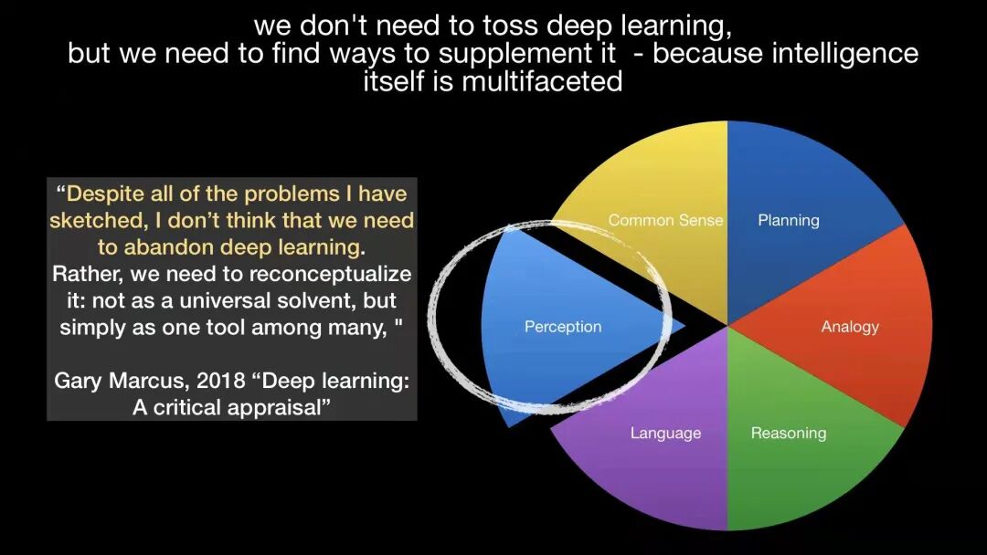 到这儿大家也能看出来,二人讨论的对象和观点是有错位的。LeCun希望如果有新的方案,仍需要封装在DL下,而Marcus的意思是新的方案需要围绕着DL进行封装,前者是关于规模的扩展,后者则是一种混合和补充。