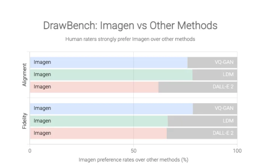 谷歌 DrawBench 基准将 Imagen 的输出,与 OpenAI 的 DALL-E 2 等文本到图像竞争对手进行比较。