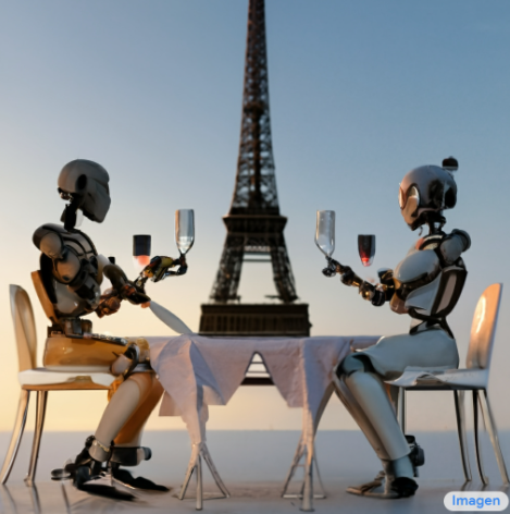 一对机器人夫妇在埃菲尔铁塔的背景下享用美食。