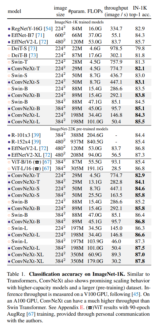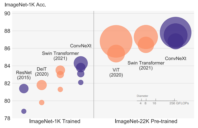 MetaAI在论文A ConvNet for the 2020s中, 从ResNet出发并借鉴Swin Transformer提出了一种新的 CNN 模型:ConvNeXt,其效果无论在图像分类还是检测分割任务上均能超过Swin Transformer,而且ConvNeXt和vision transformer一样具有类似的scalability(随着数据量和模型大小增加,性能同比提升)。