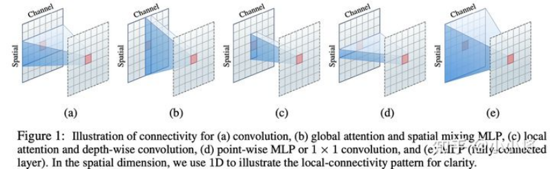 Sparse connectivity:每个token的输出只依赖于其所在local window上tokens,而且各个channel之间是无联系的;(这里忽略了attention中query,key和valude的linear projections,那么attention就其实可以看成在计算好的权重下对tokens的特征进行加权求和,而且是channel-wise的);
