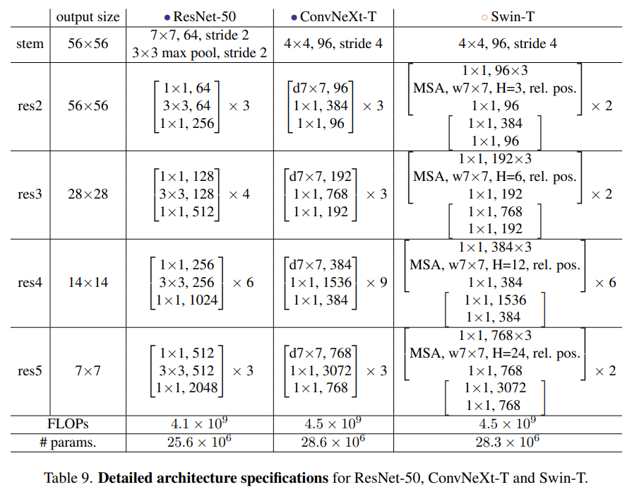 首先是各个stage的计算量占比,对比ResNet50,4个stage的blocks数量分别是(3,4,6,3),而Swin-T的设置为(2,2,6,2),4个stage的计算量比约为1:1:3:1。这里调整ResNet50各个stage的blocks数量以和Swin-T一致:从原来的(3,4,6,3)调整至(3,3,9,3)。