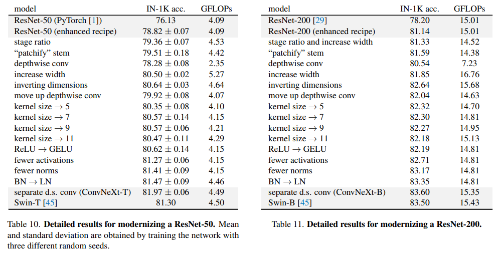 ConvNeXt 从原始的 ResNet 出发,逐步加入swin transform 的 trick,来改进模型。论文中适用 ResNet模型:ResNet50和ResNet200。其中ResNet50和Swin-T有类似的FLOPs(4G vs 4.5G),而ResNet200和Swin-B有类似的FLOPs(15G)。