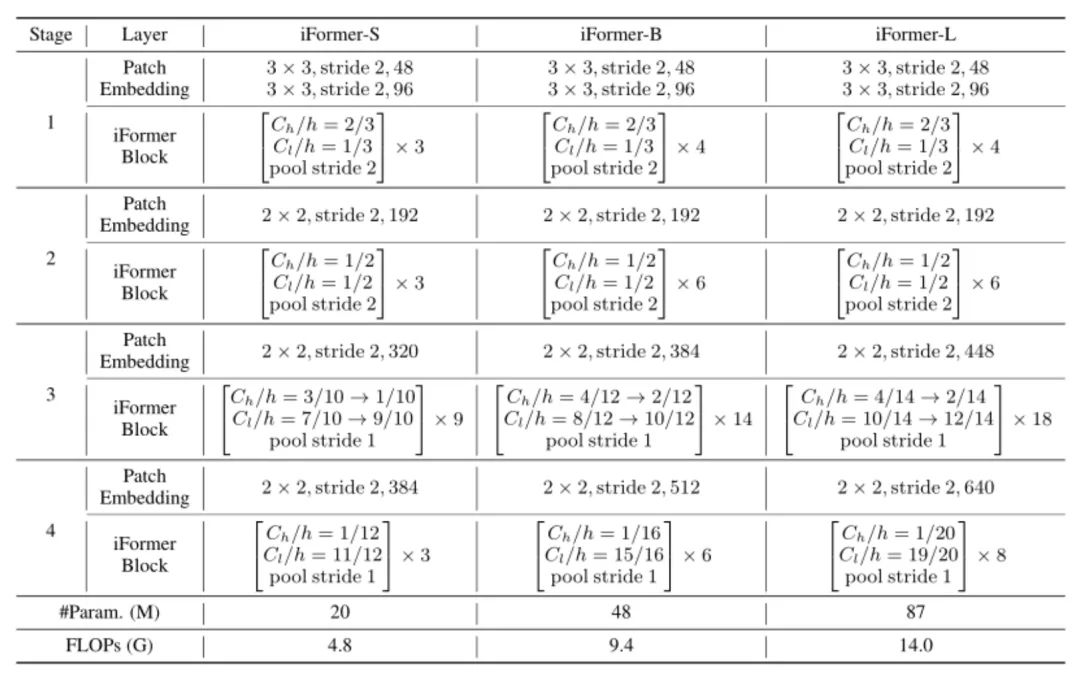 表1:不同版本iFormer的详细配置对比。