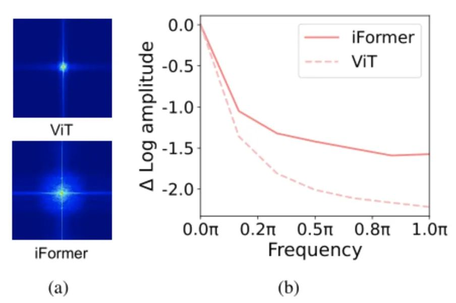 图2:(a) ViT和iFormer的傅里叶光谱。(b) 傅里叶变换的特征图的相对对数振幅。
