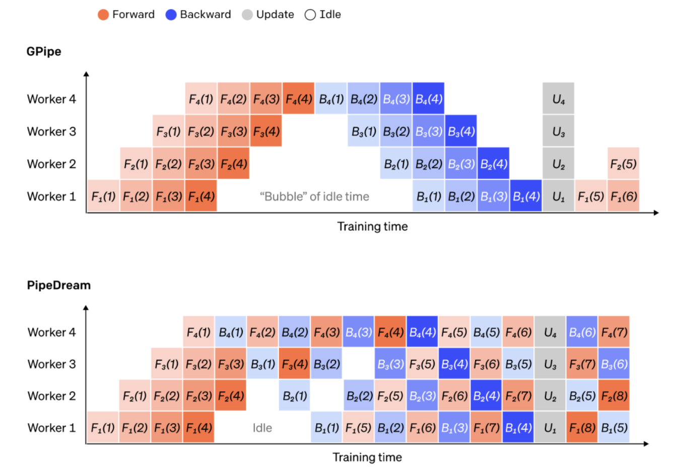 图注:GPipe 和 PipeDream 流水线方案的比较,每批使用 4 个微批次。微批次 1-8 对应于两个连续的数据批次。图中“number”表示在哪个微批次上操作,下标标记 worker ID。注意,PipeDream 通过使用陈旧参数执行一些计算来获得更高的效率。