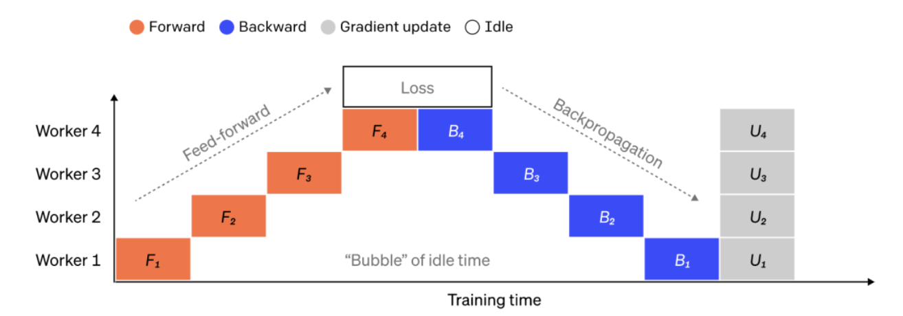 图注:一个简单的流水线并行设置插图,其中,模型被垂直分成 4 个分区。worker 1 主持第一层的模型参数(最接近输入),而 worker 4 主持第 4 层(最接近输出)。“F”、“B”和“U”分别代表前向、后向和更新操作。下标会指示在哪个 worker 上运行操作。由于顺序依赖性,数据一次由一个 worker 处理,导致产生了大量的空闲时间“泡沫”。