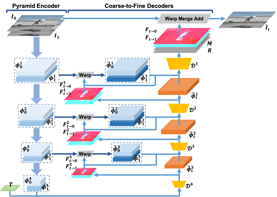 所提出的IFRNet首先使用encoder网络对两个输入帧分别提取金字塔特征,之后通过coarse-to-fine的多个decoder网络,联合refine双向中间光流和一个具有较强表示能力的中间帧特征,直到达到原始输入分辨率。更准确的中间光流可以backward warp出与目标帧更好对齐的中间帧特征,从而促进中间帧特征重建;另一方面,更好的中间帧特征能够提供更好的锚点(anchor)信息,从而促进中间光流估计。因此,这两者可以相互促进提升。