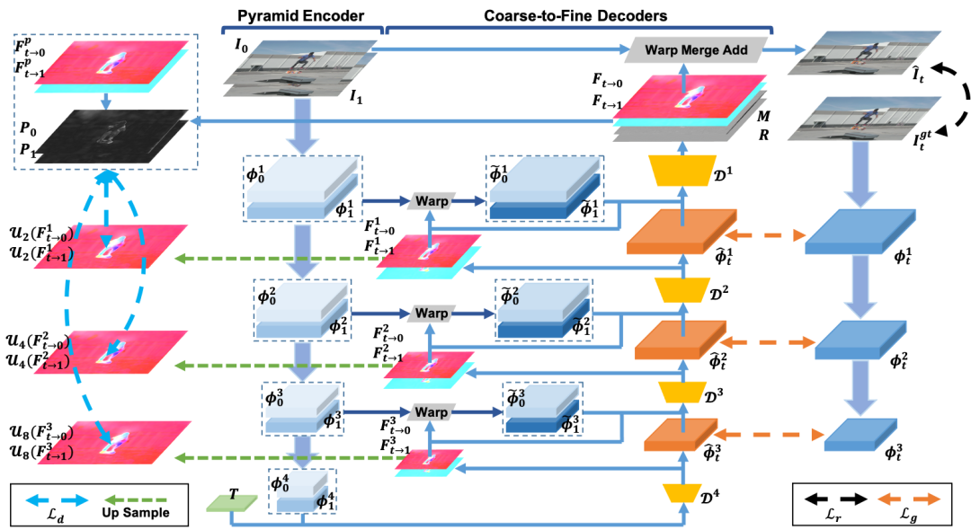 为了解决以上问题,我们首次将上述分开的中间光流估计与中间特征重建过程合并到一个encoder-decoder网络,并达到了更紧凑的模型结构与更快的推理速度,如图(c)所示。