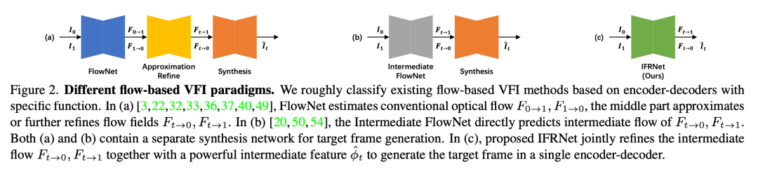 图(a),光流网FlowNet估计传统光流,中间部分encoder-decoder近似或进一步refine中间光流。图(b),中间光流网直接估计中间光流。(a) 和 (b) 都包含一个独立的合成网来对光流warp的输入帧以及特征进行编码,并合成目标帧纹理。尽管以上方案已经成为基于光流的主流解决思路,但其仍面临如下问题: