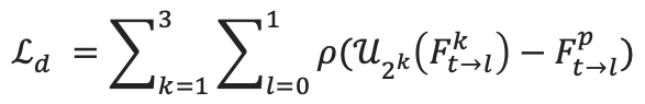 2) 面向任务的光流蒸馏损失:此损失函数通过调整每个像素位置的鲁棒性值来提供更好的面向插帧任务的中间光流监督信息。给定一个现成光流网络的预测结果作为代理标签,我们可以通过公式