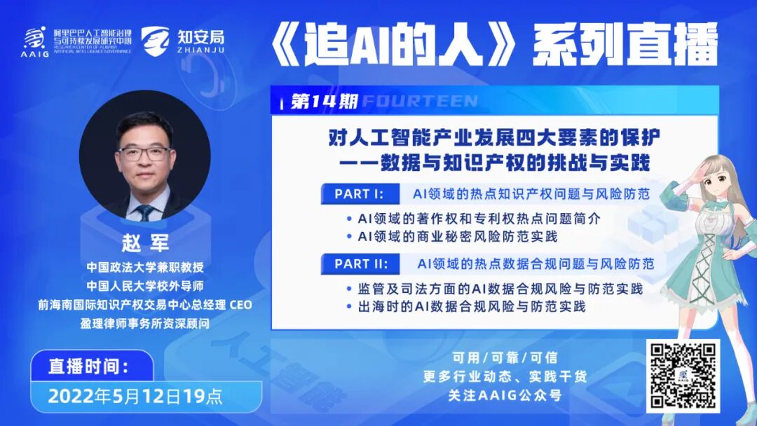 🦋 为何人工智能是否有著作权仍很难定论? 🦋 AI的技术创新成果是否可以通过现有的知识产权法律制度予以保护? 🦋 AI产品或服务出海,会遇到哪些数据风险? 🦋 以出海时的AI数据合规风险为例,浅谈人工智能知产问题司法方面防范实践? 《追AI的人》第14期《对人工智能产业发展四大要素的保护——数据与知识产权的挑战与实践》邀请了中国政法大学兼职教授、盈理律师事务所资深顾问、前海南国际知识产权交易中心总经理 CEO赵军老师分享。 以下为直播的文字回放,分为上下两篇,本文为上篇,共计8900字。 浅谈AI领域的热点知识产权和数据合规问题|《追AI的人》第14期来咯! 直播简介回顾:
