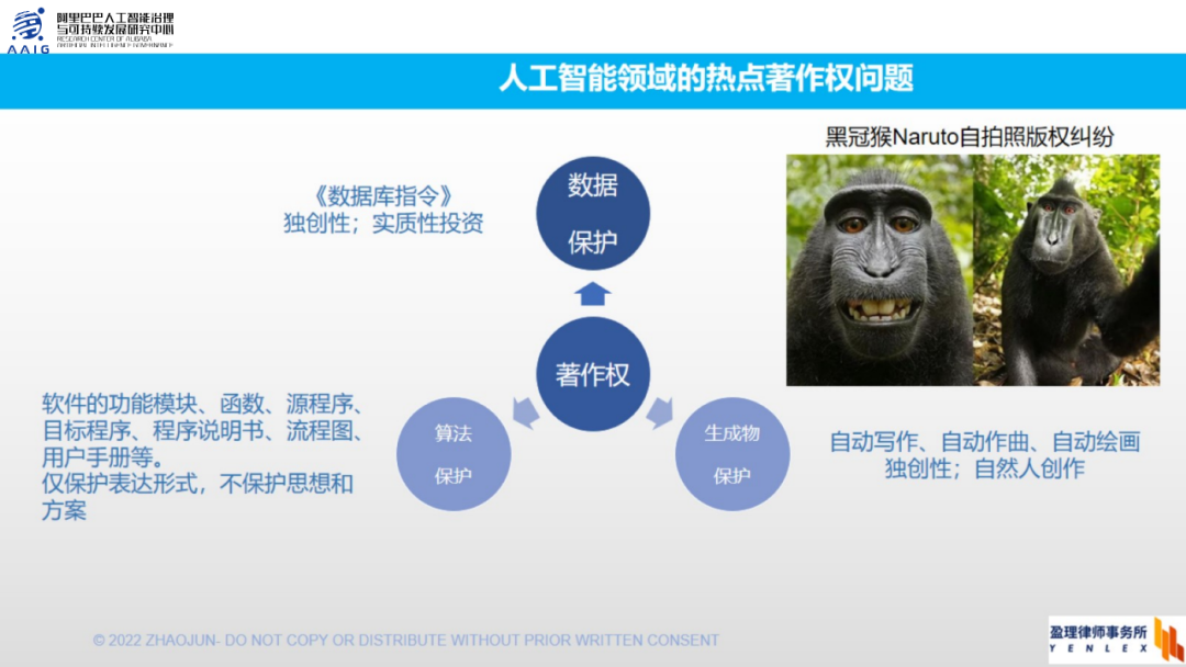 在著作权领域,主要涉及三方面问题:数据保护、算法保护、以及人工智能产物的保护。首先在数据本身的保护方面,我们现有的法律制度是有一些缺失的,一是我们对于这种大数据的保护非常缺失,现有的著作权制度可能更多保护一些小数据集。