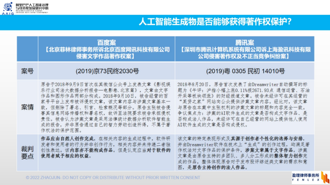 深圳的腾讯案也是类似的。一个叫dreamwriter的人工智能写了一篇财经报道类的文章,被告没有经过许可就在其网站转载。于是原告就认为构成了版权的侵权,法院的判决最后跟北京法院还是有一些区别,一个他首先认为从客体的角度来讲,这篇文章虽然由人工智能完成,但是它还是源于了创造者个性化的选择和安排,它满足了独创性的要求,因此涉案的文章它属于一个文字作品,就是他认可了它是著作权保护的课题。另外一个他回避了人工智能本身能不能够作为完成作品的人,而是认为说这个文章它是由原告主持的,多个团队多人分工形成的一个集体的智力创作,是原告主持创作的法人作品。换句话说,深圳法院认为原告就是把人工智能当做一个工具,由一个企业运营完成的职务作品,因此作品应当由法人所有,因此法院认为这侵犯了版权。