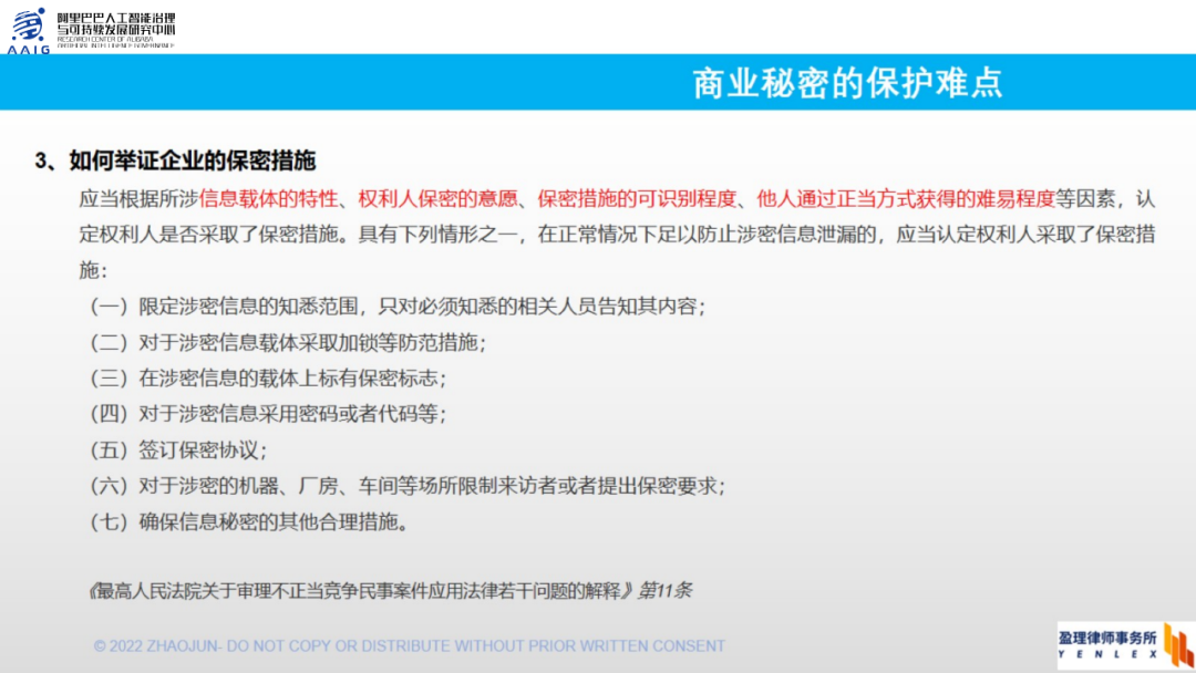 第四个难点就是怎样举证企业采取了相应的保密措施,这点非常重要。因为很多诉讼打不赢的原因就是原告没有办法举证证明采取了相应的保密措施。所谓的保密措施不是简单的在员工劳动合同当中,或者是公司的规章制度当中写明在职期间接触的所有信息都需要保密,或者要求所有员工保护企业的商业秘密,不是这么简单。而是具体采取一些措施,比如对员工进行分级管理,不是所有人都要保密,特定人员才需要明确其保密责任。
