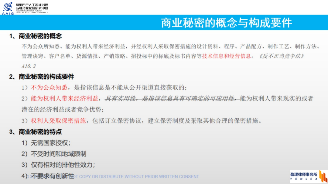 针对两个案子,我们一方面了解到,商业秘密的保护对于一个企业来讲还是非常重要的,特别是对于人工智能领域涉及到源代码的核心商业机密,无论是技术方面,还是商业方面,都有可能会造成对公司的重大损失,所以商业秘密的保护,在人工智能领域有特别重要的价值。那么商业秘密是什么?