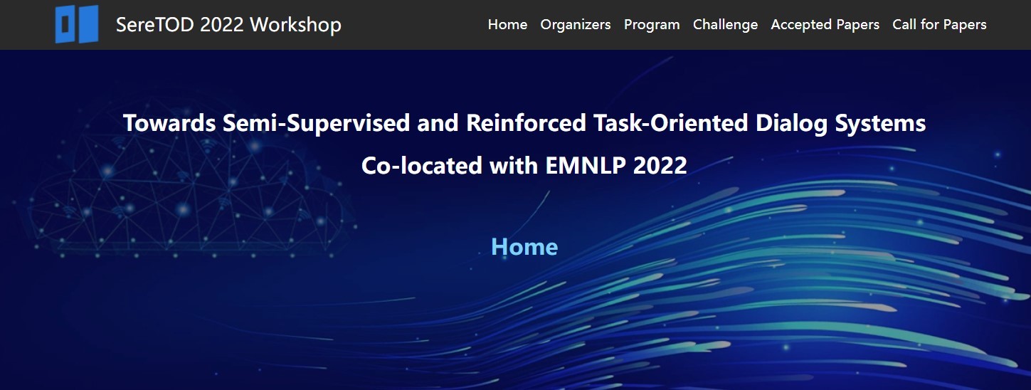 EMNLP是由国际语言学会(ACL)主办的自然语言处理领域的顶级国际会议。特定主题的研讨会(Workshop)是 EMNLP 大会议程的精彩部分,每年从全球学者的提案(Proposal)中遴选。EMNLP 2022 Workshop Proposal 竞争激烈,在 EMNLP 官方公布的 2022 Workshop Proposal 收录结果中,由清华大学和中国移动联合承办的 SereTOD Workshop “Towards Semi-Supervised and Reinforced Task-Oriented Dialog Systems” 及相关挑战赛 SereTOD Challenge 名列其中。