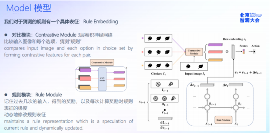 受认知科学的启发,宋森教授团队首先设计了一个更像人类学习规则的任务,该任务旨在通过试错的方式来学习抽象规则。然后构建了一种新的架构来解决此任务,该架构主要根据先前的试验结果学习规则的表征,其对规则构建一个嵌入向量表征,通过对比模块和规则模块分别进行规则的猜测和规则表征的动态修改,使得该结构可以快速适应没有见过的规则组合,从而学习到规则,实验表明网络在推广能力和泛化性上都有明显的提升。其次,我们提出通过内部推理的过程来学习更鲁棒的规则表征。该方法关键思想是将学到的规则重复应用到不同的实例中,以期对规则有一个全面的理解(即更鲁棒的表征),在瑞文测试中相比于其他方法表现出更好的推广和泛化能力。因此,抽象规则的学习能力对于提高人工神经网络的推广和泛化能力具有重要作用。