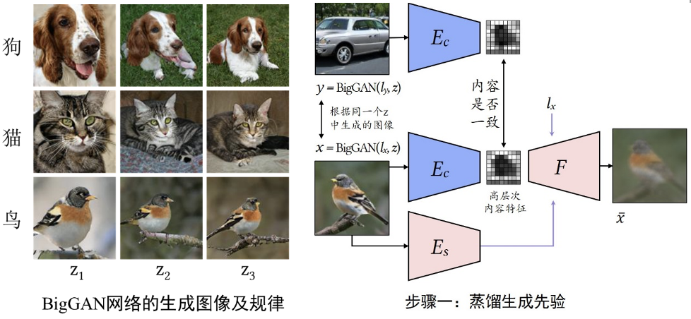 如图2左侧所示,我们的算法基于这样的观察:BigGAN使用相同的噪声不同的类别标签生成的图像,尽管形态各异,但是具有高度统一的语义对应关系,例如朝向、姿势等,这些规律提供了有效的生成先验,用于建立不同领域之间的关系。然而BigGAN生成的图像质量有限,且图像种类限制在ImageNet的1000类,并不适合直接用于图像转换。为此,我们训练内容编码器蒸馏该先验信息,提取BigGAN相同的噪声生成的图像所共享的高层次内容特征。