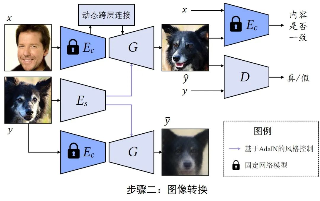 在训练好内容编码器Ec后,我们固定Ec,训练图像转换网络,实现图像转换。预训练的Ec允许我们约束转换前后图像内容特征的一致性,较标准的循环一致性,无需同时训练反向转换的网络,且约束在更加鲁棒的特征空间。