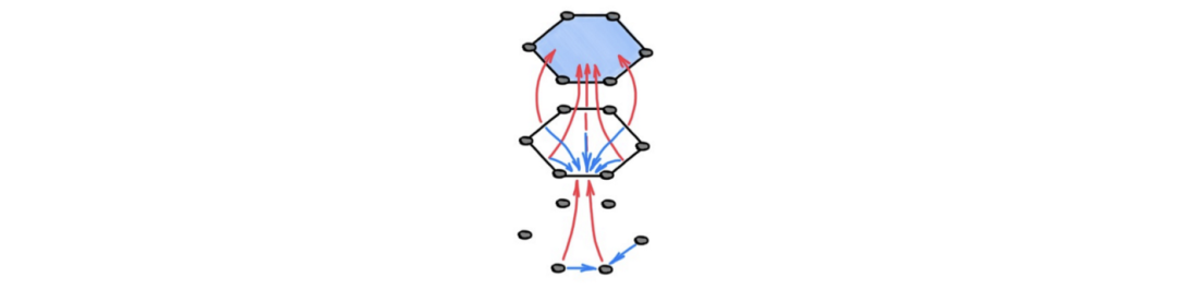 图注:拓扑信息传递示意图。蓝色箭头描述了上层相邻细胞之间的“水平”信息传播,即同一高维细胞的边界上的细胞。红色箭头描述了“垂直”信息传播,即细胞从其边界的低维细胞中接收信息。将来自边界细胞的信息汇总到一个更粗的表示中,这种计算可以被解释为一种(可微分的)集合形式。