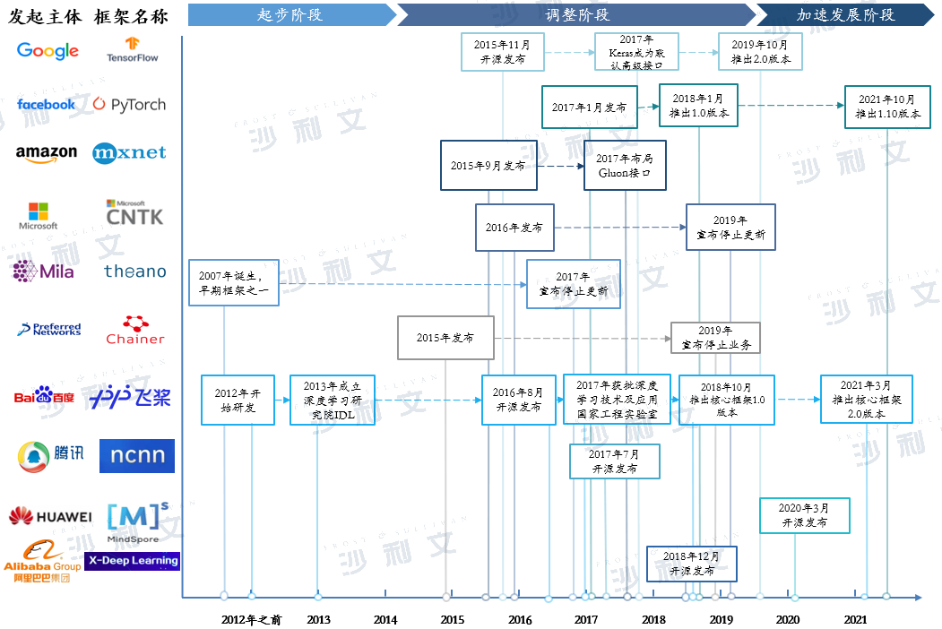 纵观深度学习软件框架的发展历程,大致可以分为起步、调整和加速发展三阶段。2014年开始,全球人工智能学术界及产业界各研发主体陆续开源旗下自主研发深度学习软件框架,并以框架为主体搭建人工智能开放开发平台,推动人工智能产业生态的建立。其中,由谷歌团队开发的TensorFlow及由Meta团队开发的PyTorch两款深度学习软件框架占据业界相对主导地位。
