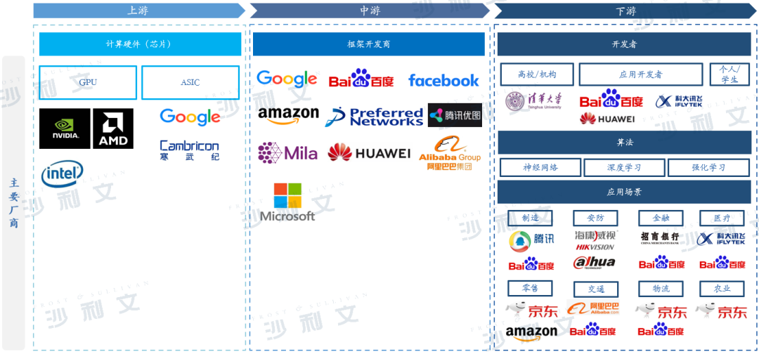 深度学习软件框架产业链主要由上游硬件、中游框架开发商和下游应用场景构成。上游是深度学习实现的基础,主要包括计算硬件(芯片),为深度学习软件框架提供算法及算力支撑。中游是深度学习软件框架的核心,以模拟人的智能相关特征为出发点,构建应用技术路径,主要包括语音识别、计算机视觉和自然语言处理。下游主要为深度学习软件框架在各细分场景的应用,主要包括制造、安防、金融、医疗、零售、交通、物流、农业等领域。未来,上游基础运算升级、中游应用技术成熟以及下游应用场景融合,都将为其后续发展深度赋能。