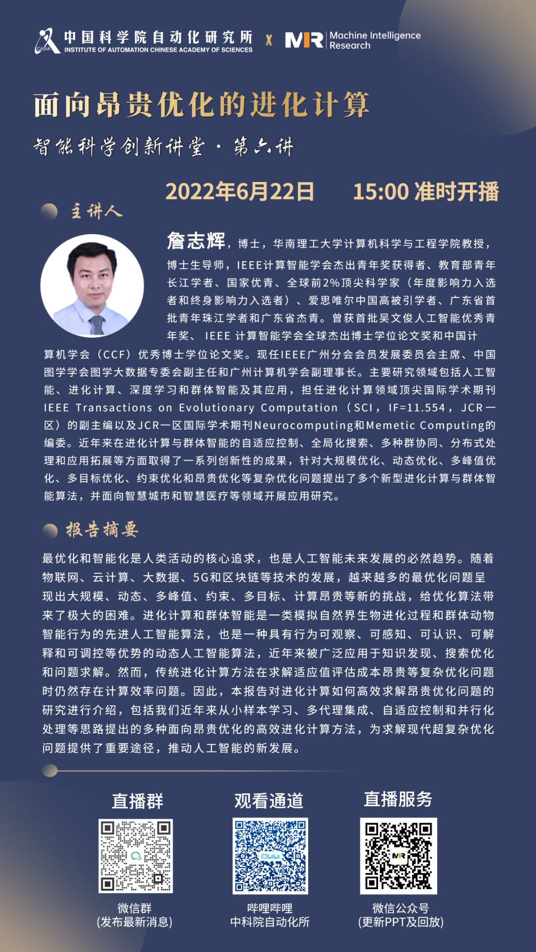 创新讲堂第六讲邀请到MIR优秀作者、华南理工大学詹志辉教授带来"面向昂贵优化的进化计算"的报告。2022年6月22日(周三)15点,诚邀您出席!