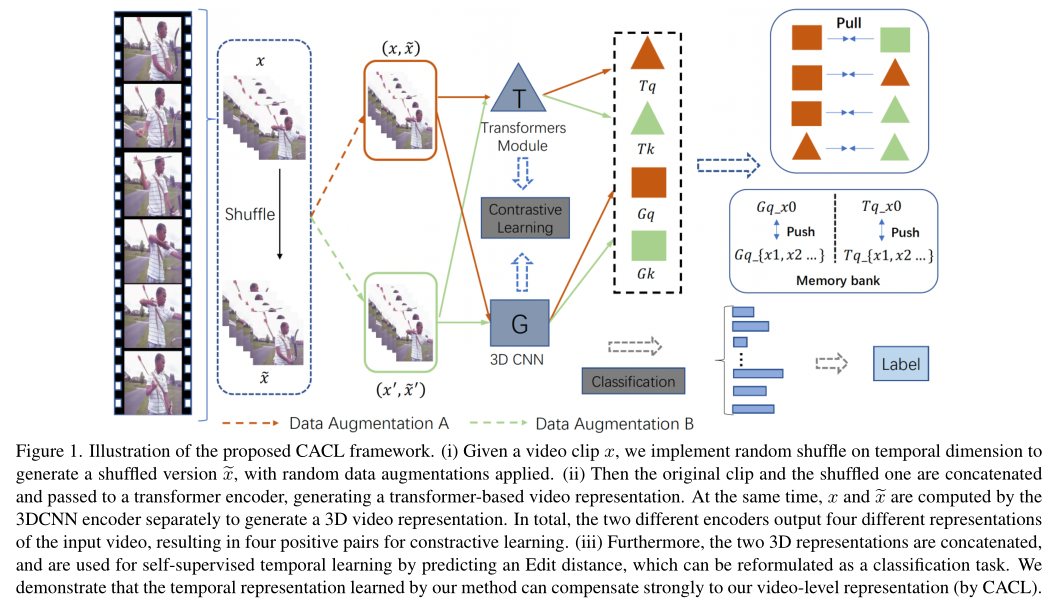 在本文中,作者提出了一种新的用于自监督视频表示学习的跨架构对比学习(cross-architecture contrastive learning,CACL)框架。CACL由一个3D CNN和一个视频Transformer组成,它们被并行使用以生成用于对比学习的各种正对。这使得模型能够从这些不同但有意义的对中学习强表示。