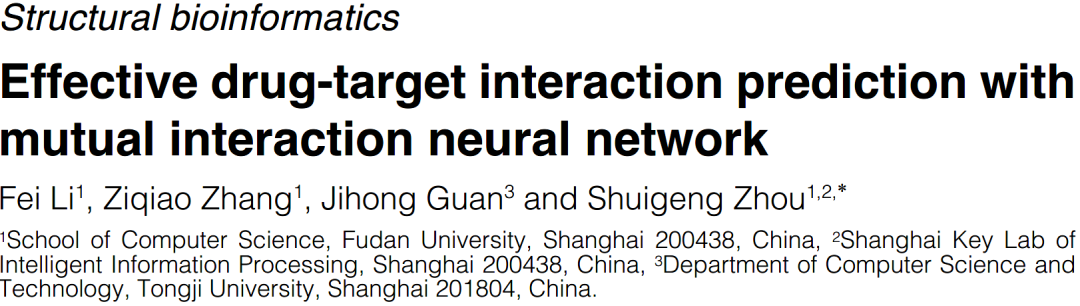 本文介绍的是通讯作者为复旦大学计算机科学技术学院的周水庚教授近期被Bioinformatics接收的一篇题为“基于相互作用神经网络的有效药物-靶标关联预测”的论文。