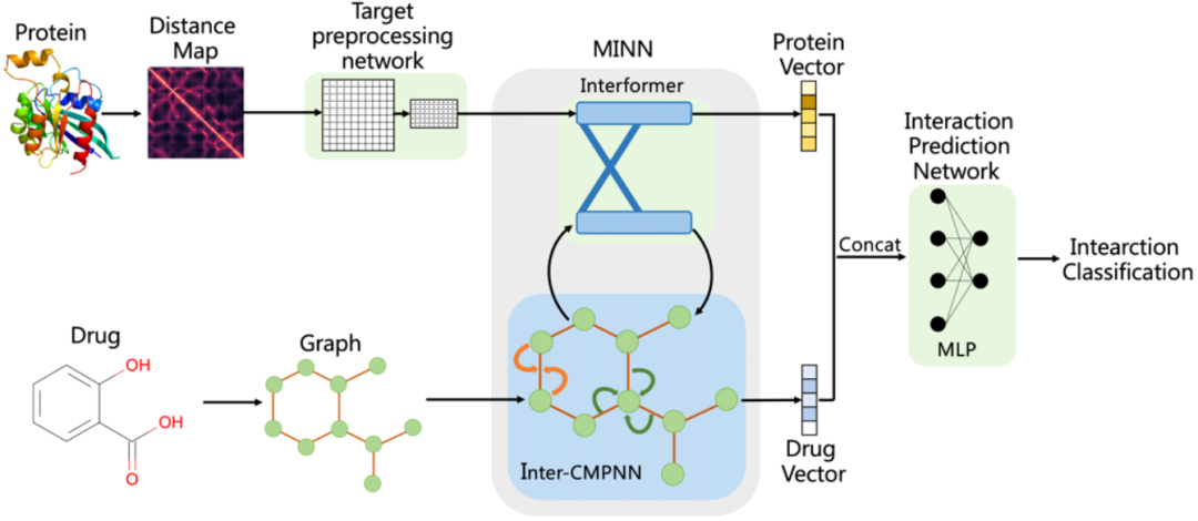 结果:因此,本文提出了一种新的DTI预测模型MINN-DTI。MINN-DTI将interacting-transformer模块(称为Interformer)与一个改进的通信信息传递神经网络(Communicative Message Passing Neural Network, CMPNN)(称为Inter-CMPNN)相结合,以更好地捕捉药物和靶点之间的双向影响,这两种影响分别由分子图和距离图表示。在DUD-E、human和BindingDB三个基准数据集上,该方法获得了比最新方法更好的性能。MINN-DTI还通过赋予对药物和靶标之间的相互作用贡献更大的氨基酸和原子以更大的权重来提供良好的解释性。