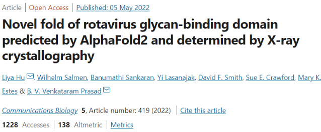 该研究以「Novel fold of rotavirus glycan-binding domain predicted by AlphaFold2 and determined by X-ray crystallography」为题,于 2022 年 5 月 5 日发布在《Communications Biology》。
