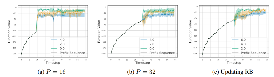Branin任务在多个Rˆ值下的推出轨迹。图(b)显示了前缀长度为32的轨迹,在图(a)中,将前缀长度改为16,而在图(c)中,在后缀子序列中更新评估RB。可以看到,与高Rˆ相比,低Rˆ推出的质量更高的点。为了验证本文将regret预算作为控制探索和开发程度的旋钮的语义,在图5c中,本文还绘制了更新后缀中RB值的轨迹。如果RB变成非正值,就停止推出。很明显,对于较小的Rˆ,代理模型迅速加速到高质量的区域并不断地开发,而对于高Rˆ,它逐渐转移到高质量的点。这表明Rˆ是如何控制从探索到开发的转变速度的。