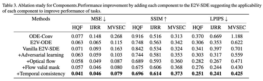 此外,该研究声称成功地采用了多种图像合成技术来提高图像清晰度和时间一致性。通过对模拟和真实场景数据集进行广泛的实验,研究者验证了 E2V-SDE 模型在各种视频重建设置下都优于 SOTA 方法。在图像质量方面,LPIPS 分数提升高达 12%,重建速度比 ET-Net 快 87%。