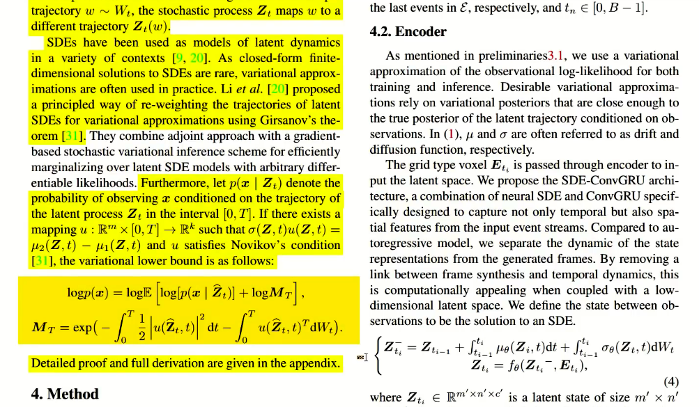 在这篇论文中,作者提出了一种称为 E2V-SDE 的新模型,其动力学由随机微分方程 (SDE) 在潜在空间中控制。E2V-SDE 可以在任意时间步长上快速重建图像,并对看不见的数据做出实际预测。