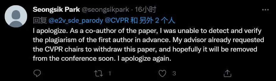 但很快,这个第一作者就被自己的队友「卖」了。在一份道歉的帖子中,合著者之一表示,自己很抱歉没有尽到检查、核实的义务,没有提前发现第一作者的剽窃行为,目前,他们的导师正在联系 CVPR 主席撤回该论文。