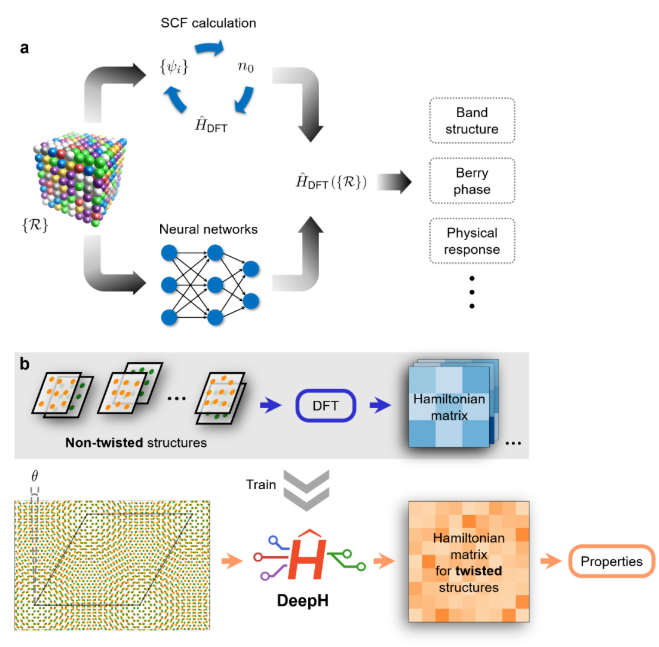 DeepH方法用于高效电子结构计算的示意图。a, 密度泛函理论哈密顿量是材料构型的函数,通常由耗时的自洽计算得到,DeepH方法利用深度神经网络预测给定原子构型的哈密顿量,得到的哈密顿量可以被用于计算各种物理性质。b, 使用DeepH方法研究转角范德瓦尔斯材料的流程图。通过无转角材料构型的密度泛函理论结果训练,DeepH模型可以高效准确地预测各种转角材料构型的物理性质。