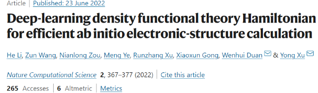 该成果以「Deep-learning density functional theory Hamiltonian for efficient ab initio electronic-structure calculation」为题,于 2022 年 6 月 23 日发表在《Nature Computational Science》。