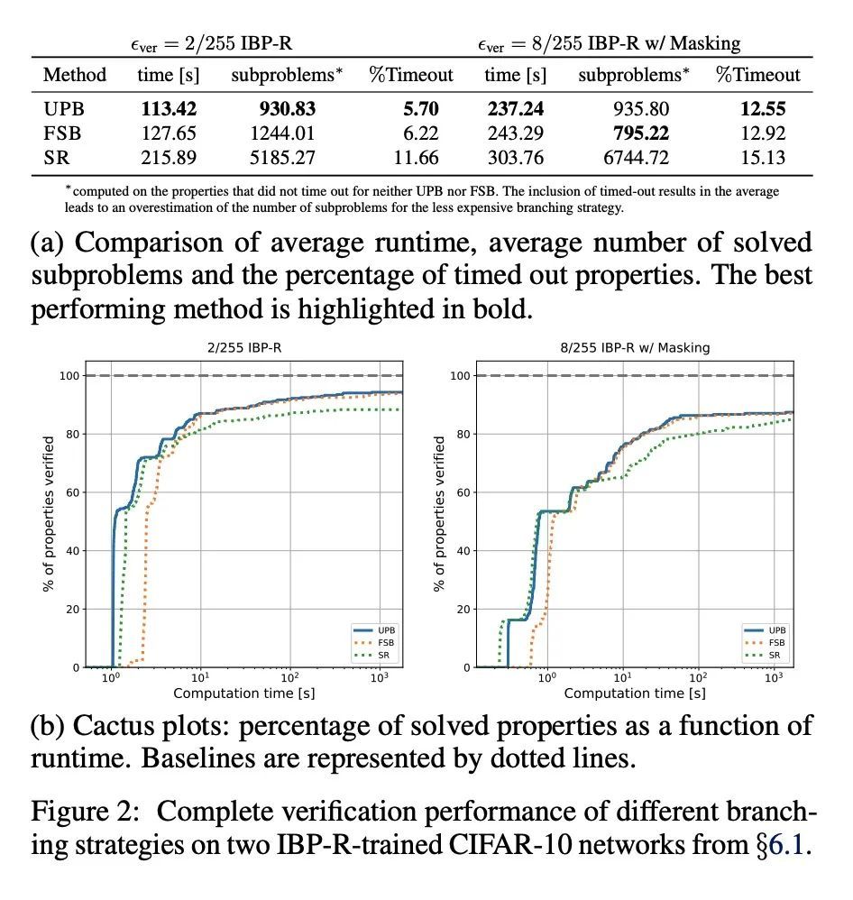 通过分支定界验证对抗鲁棒性的IBP正则化。最近的工作试图通过在比原始扰动更大的域上运行攻击并向目标添加各种正则化项来提高对抗性训练网络的可验证性。然而,这些算法要么表现不佳,要么需要复杂而昂贵的阶段性训练程序,阻碍了它们的实际应用性。本文提出了IBP-R,一种既简单又有效的新型验证训练算法。IBP-R通过将对扩大域的对抗性攻击与基于廉价的区间边界传播的正则化项结合起来,使非凸验证问题与其近似值之间的差距最小化,从而带来网络可验证性。通过利用最近的分支定界框架,本文表明IBP-R在CIFAR-10的小扰动下获得了最先进的验证鲁棒性-准确性权衡,同时训练速度明显快于之前的相关工作。此外,本文提出UPB,一种新的分支策略,依靠基于β-CROWN的简单启发式方法,降低了最先进的分支算法的成本,同时产生了质量相当的分支。