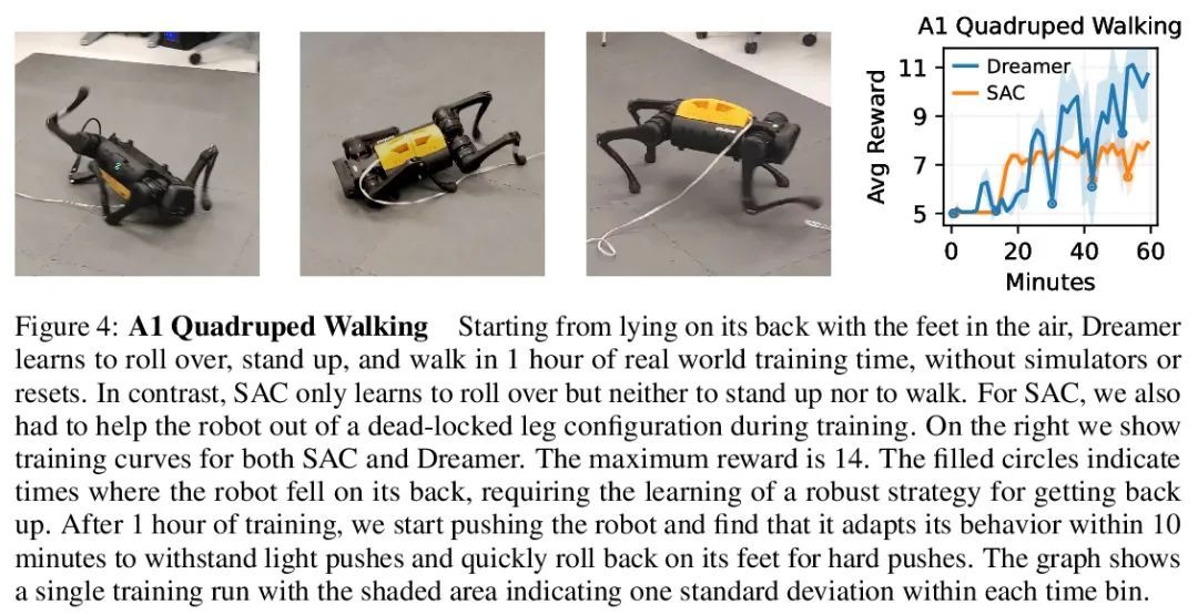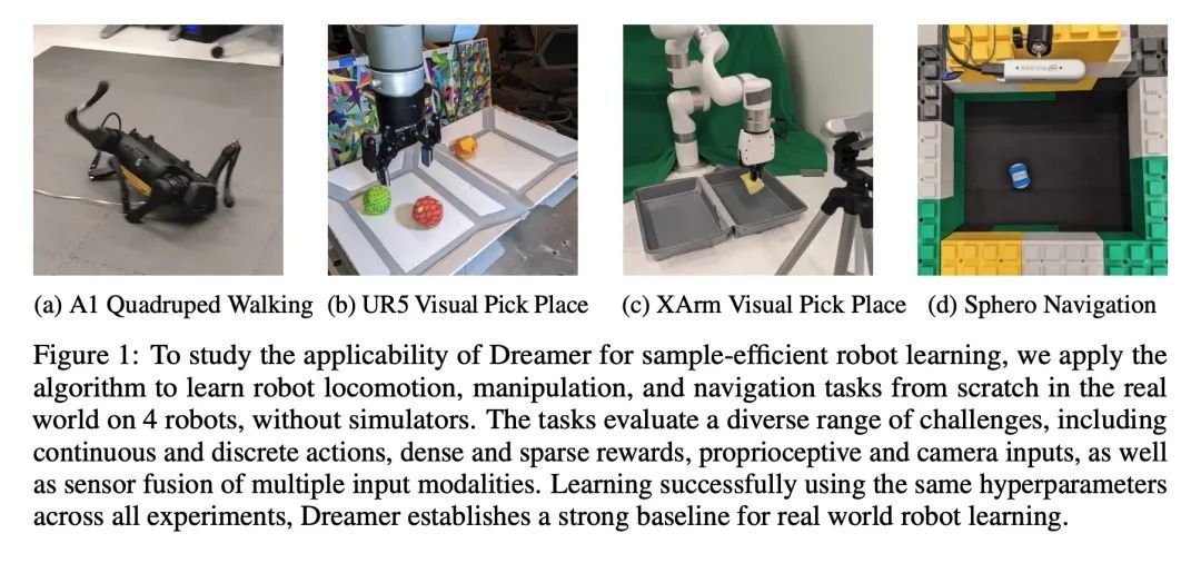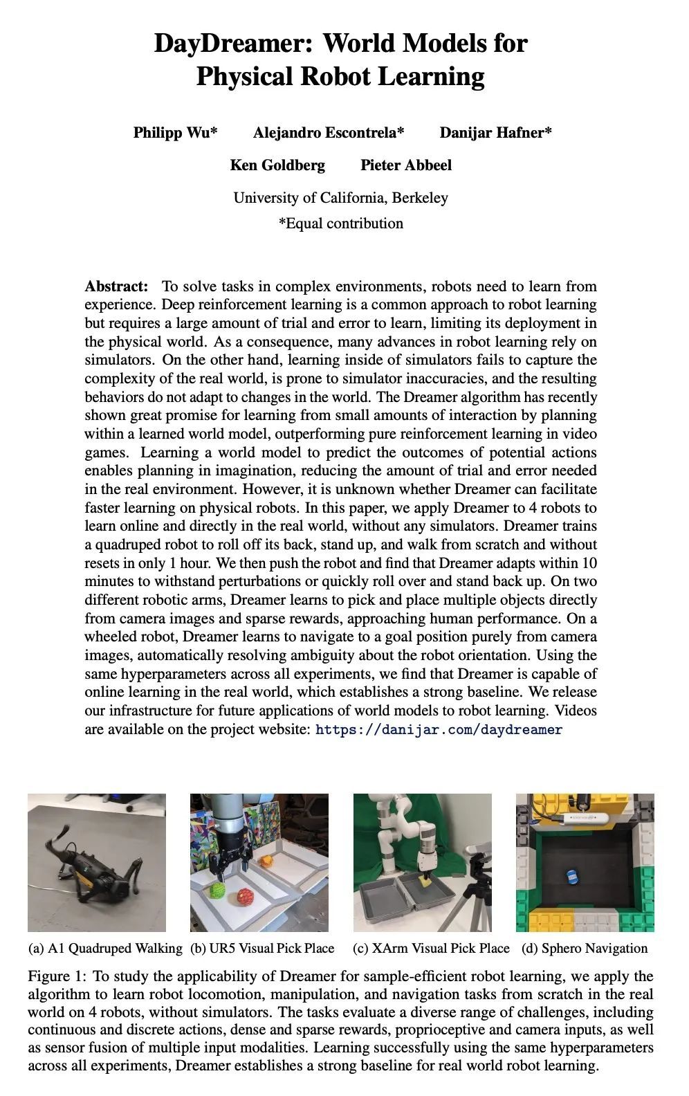 DayDreamer: 物理机器人学习的世界模型。为解决复杂环境中的任务,机器人需要从经验中学习。深度强化学习是一种常见的机器人学习方法,但需要从大量的试错中学习,限制了其在物理世界的部署。因此,机器人学习方面的许多进展都依赖于模拟器。另一方面,在模拟器内的学习不能捕捉到真实世界的复杂性,容易出现模拟器不准确的情况,而且所产生的行为不能适应世界的变化。最近,Dreamer算法通过在学习的世界模型内进行规划,显示出从少量互动中学习的巨大前景,在视频游戏中的表现优于纯粹的强化学习。通过学习世界模型来预测潜在行动的结果,可以在想象中进行规划,减少在真实环境中所需要的试错的数量。然而,Dreamer是否能促进物理机器人的快速学习还不得而知。本文将Dreamer应用于4个机器人,在没有任何模拟器的情况下,直接在现实世界中在线学习。Dreamer只用了1个小时就训练了一个四足机器人从头开始翻滚、站立和行走,而且没有复位。推动机器人,发现Dreamer在10分钟内就能适应,以承受扰动或快速翻身和站起来。在两个不同的机器人手臂上,Dreamer学会了直接从摄像头图像和稀疏的奖励中挑选和放置多个物体,接近人类的表现。在一个有轮子的机器人上,Dreamer学会了纯粹从摄像机图像中导航到目标位置,自动解决了关于机器人方向的模糊性。在所有实验中使用相同的超参数,发现Dreamer能在现实世界中进行在线学习,这就建立了一个强大的基线。